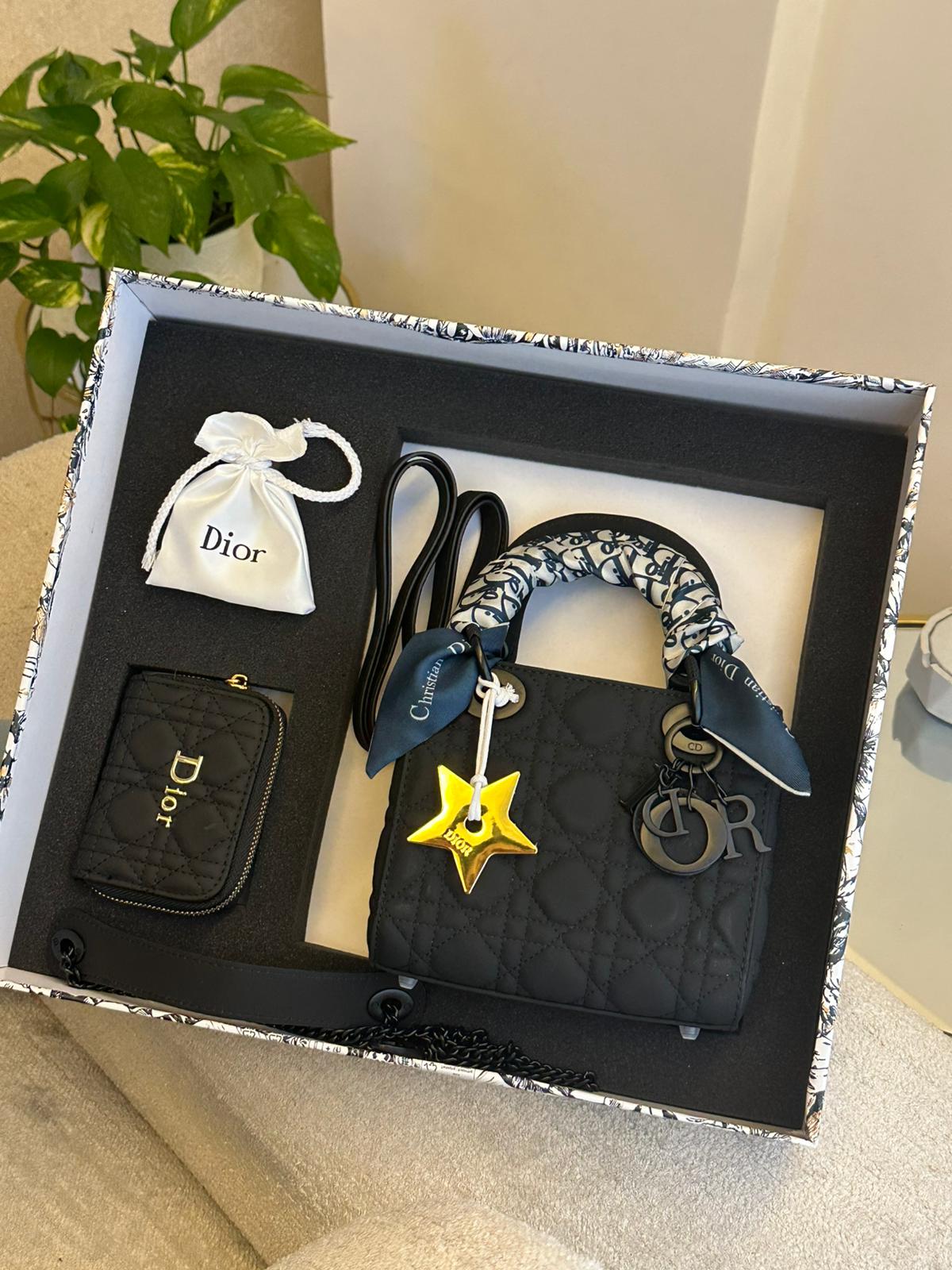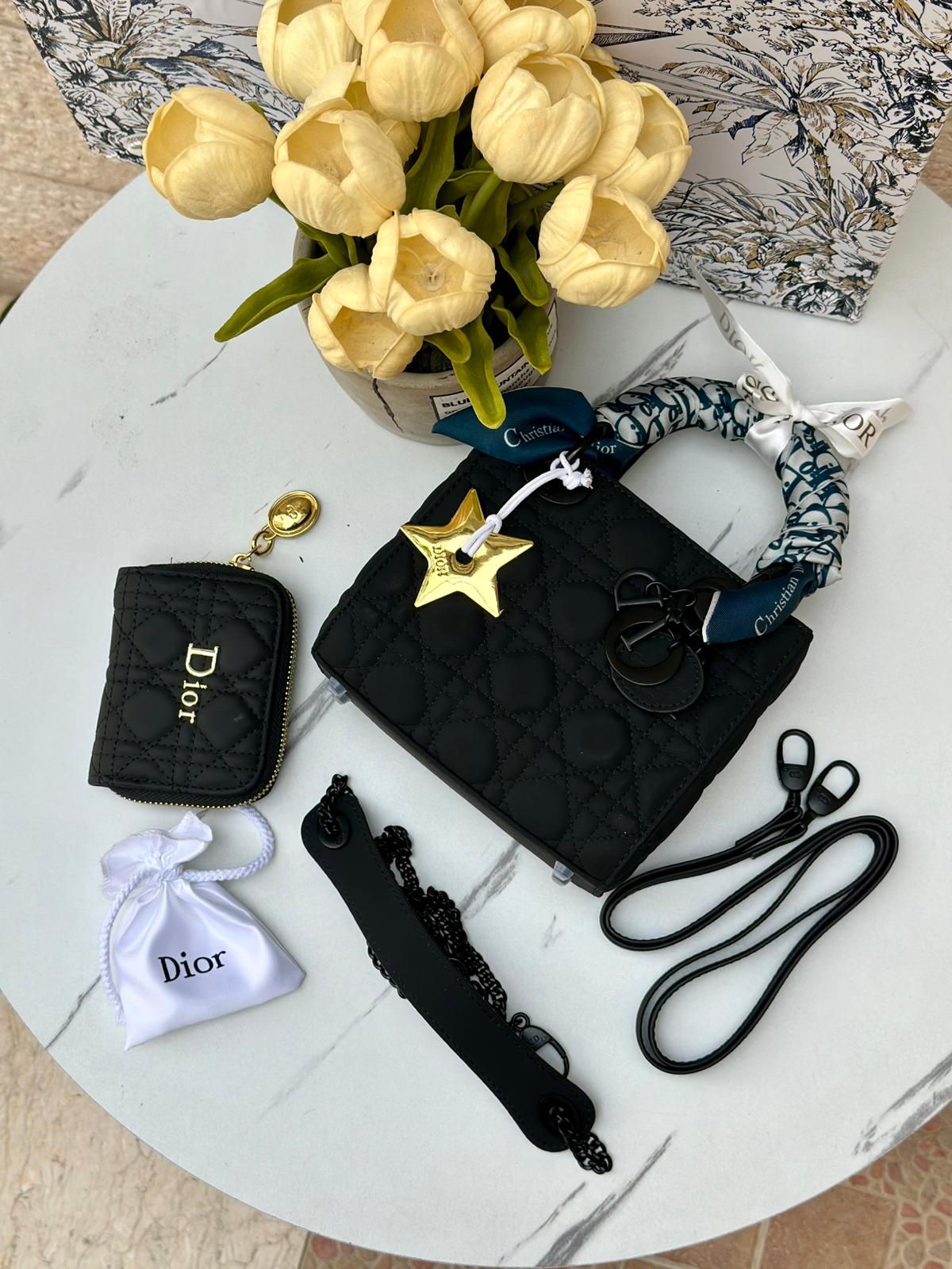 بكج DIOR اسود ، حقيبة + محفظة + ماديليا النجمة + حزامين (حزام جلد +حزام سلسلة) + وشاح