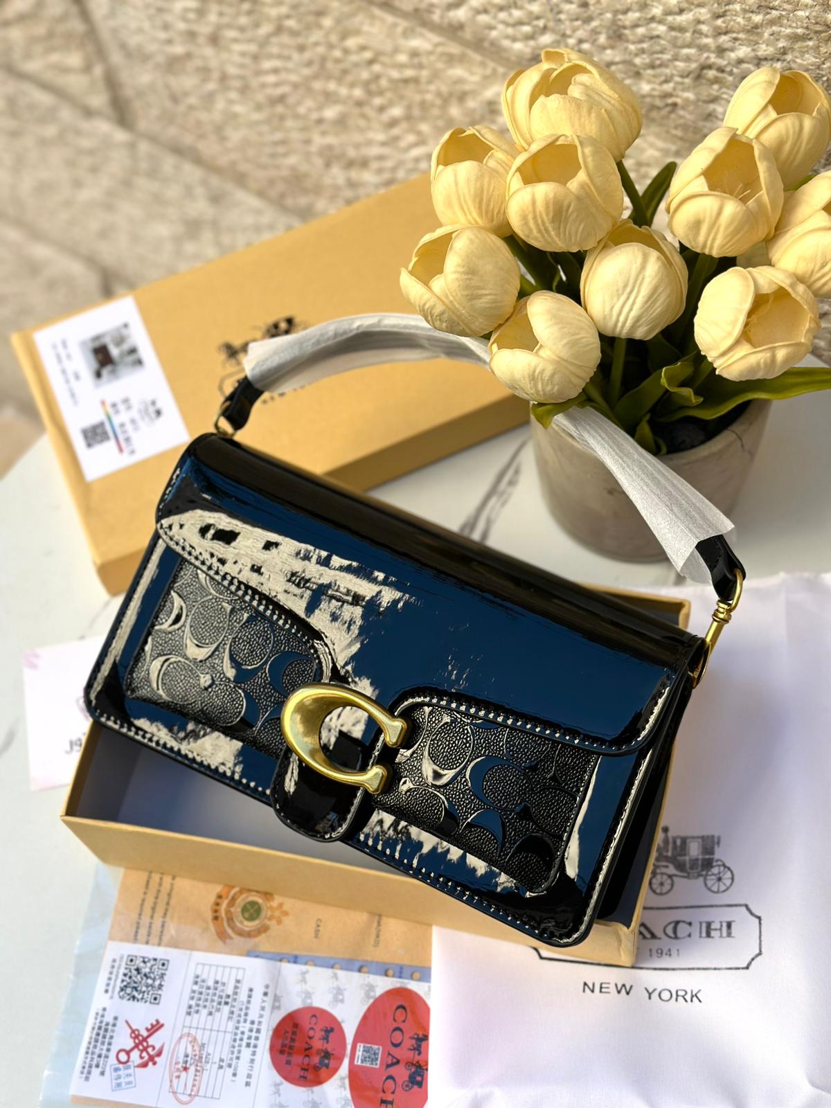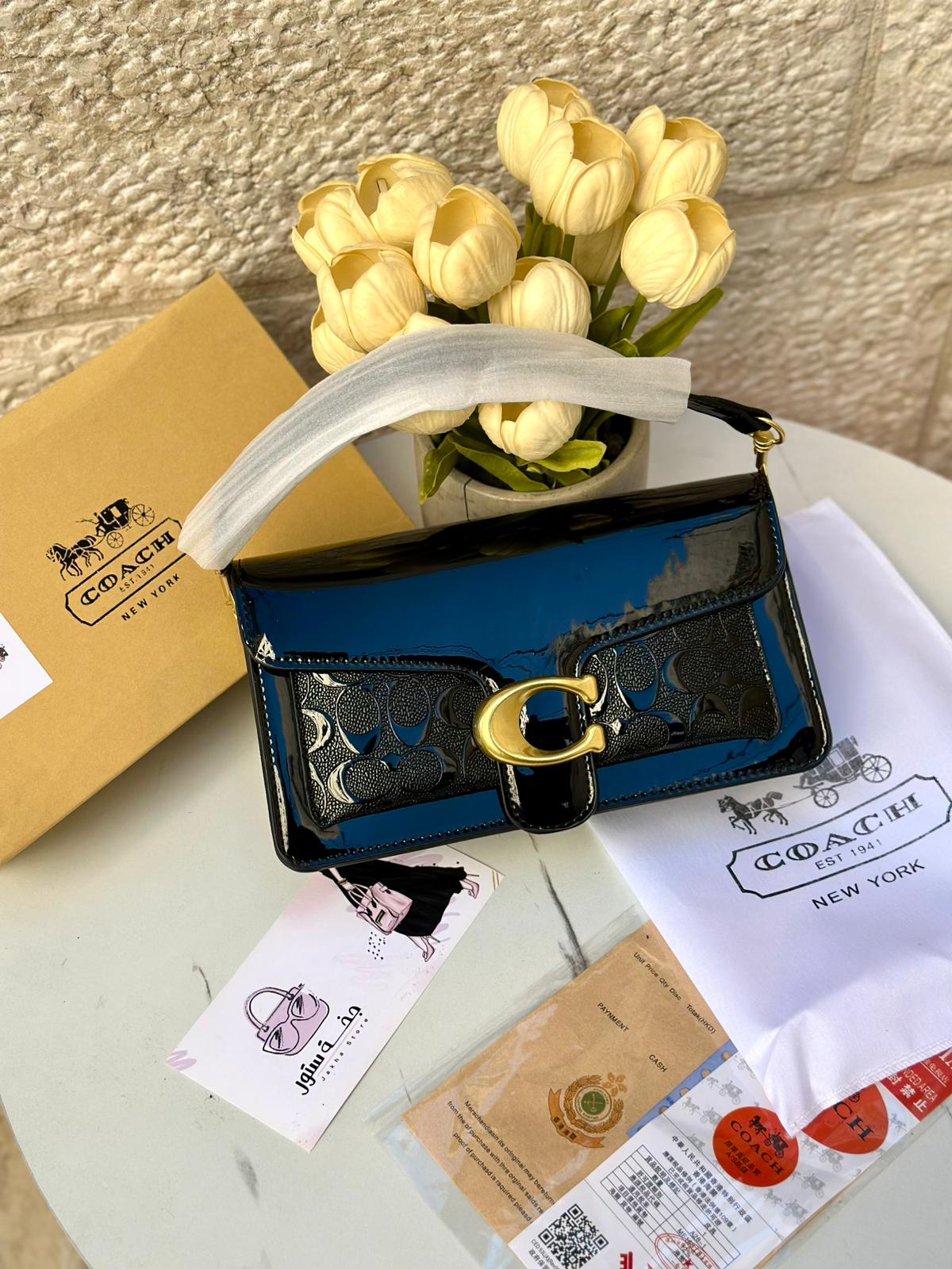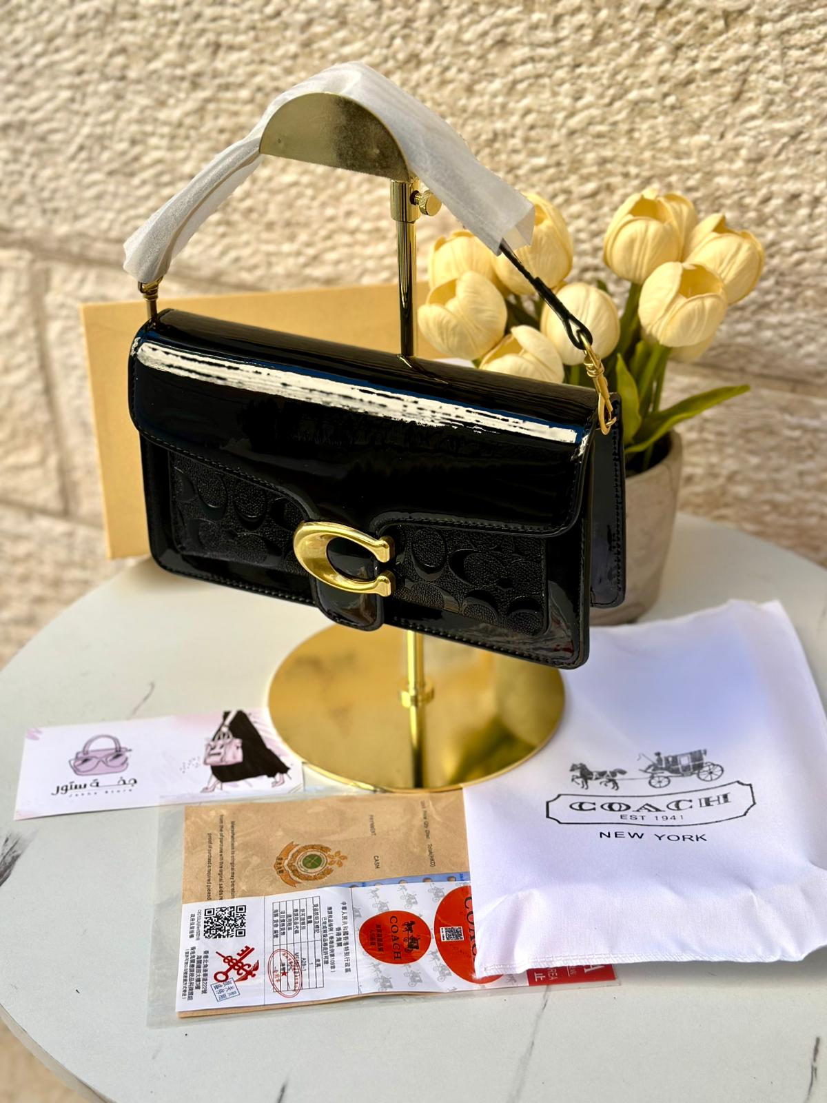 حقيبة كوتش تابي، اصدار 3d ، اسود لامع، هاردوير ذهبي، قاعدة 27سم