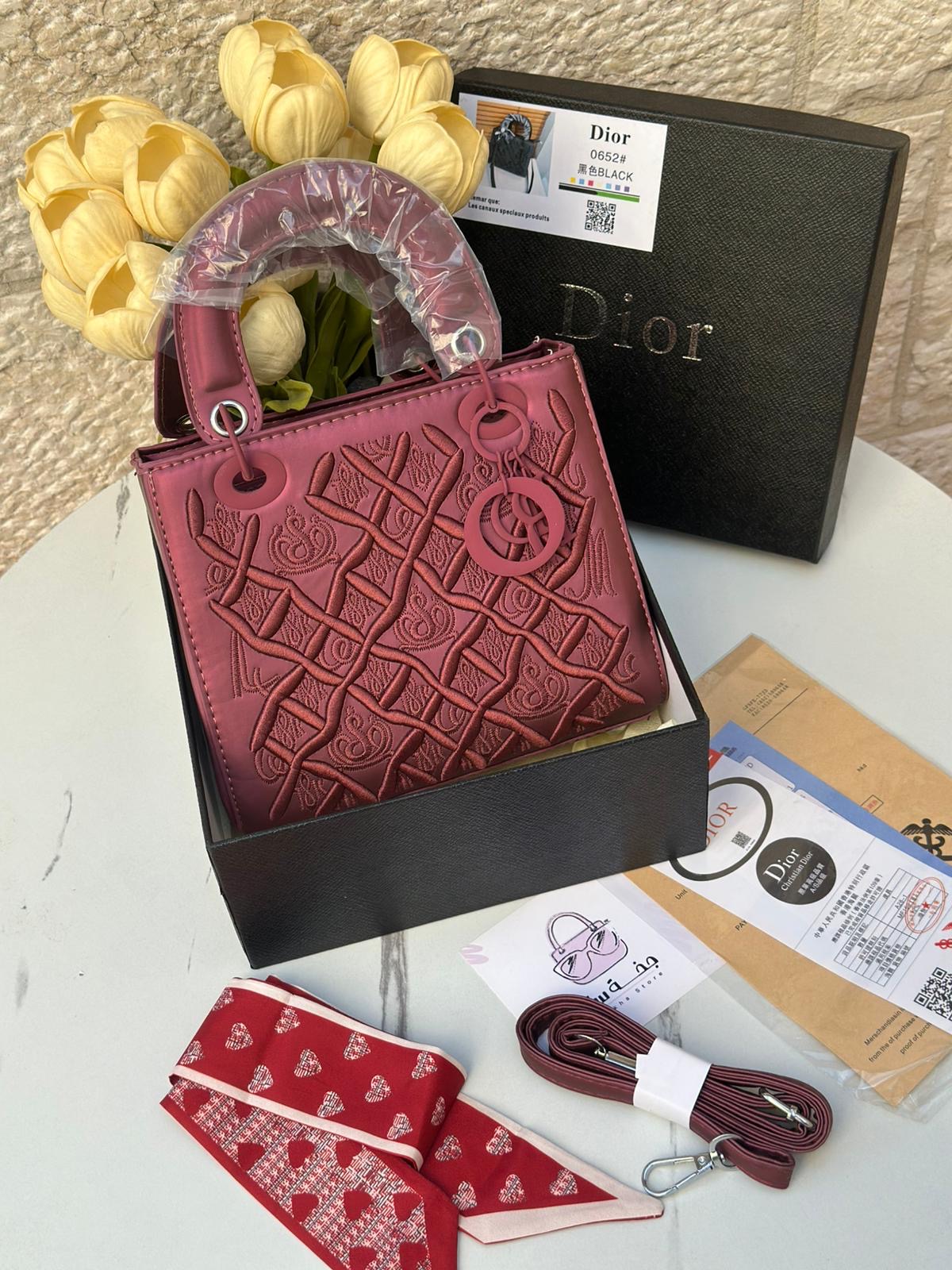 ليدي ديور مطرز ،مع علبة، قاعدة 22سم 🍇مع حزام اضافي رفيع + وشاح.